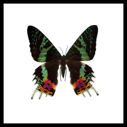 These specimens were responsibly sourced from licensed butterfly farms and have passed away naturally. By purchasing a print, you can enjoy the beauty of these creatures in a responsible and ethical manner. Choose from 100 x 100cm or 50 x 50cm sizes, each framed with a classic white or black 30mm wide frame. Bring the beauty of the butterfly world into your home today.